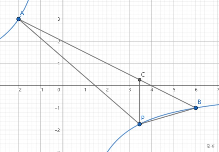 先设 P(x,−x6),并易得 yAB=−21x+2。